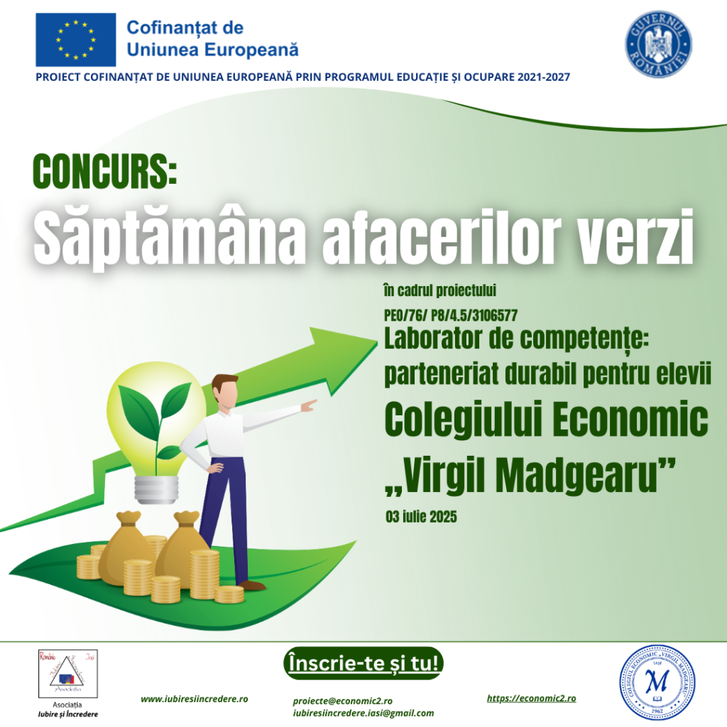 Pe 03 iulie 2025, în cadrul proiectului Laborator de competențe: parteneriat durabil pentru elevii Colegiului Economic „Virgil Madgearu”, cod SMIS 310657, cofinanțat din Fondul Social European Plus (FSE+), prin Programul Educație și Ocupare 2021–2027, a avut loc concursul tematic „Săptămâna afacerilor verzi”, eveniment care a reunit idei inovatoare și inițiative antreprenoriale sustenabile.