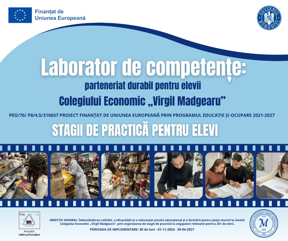 În luna octombrie 2025, am demarat stagiul de pregătire practică, an școlar 2025-2026, pentruelevii din clasa a XII-a, liceu– specializările „Tehnician în activităţi economice” și „Tehnician în activităţi de comerț” din cadrul Colegiului Economic „Virgil Madgearu”, Iași la operatorii economici, partenerii de practică din proiect.