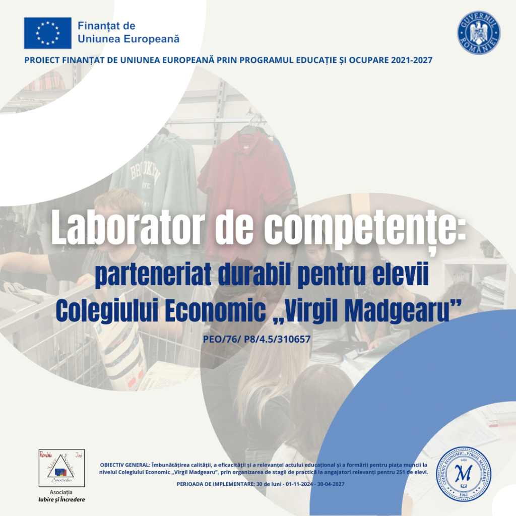 Proiectul se derulează în perioada 01.11.2024 – 30.04.2027 și se adresează unui grup țintă format din 251 de elevi ai Colegiului Economic „Virgil Madgearu” Iași, fiind implementat de Asociația Iubire și Încredere, în parteneriat cu unitatea de învățământ Colegiul Economic „Virgil Madgearu”.